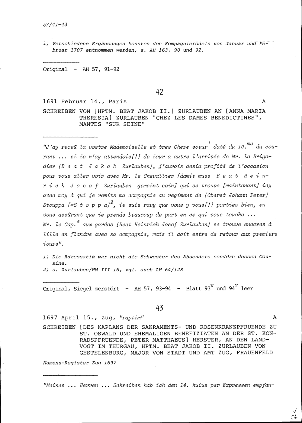 Schreiben von Beat Jakob II. Zurlauben, Hauptmann, an Anna Maria Theresia Zurlauben bei den Benediktinerinnen in Mantes-sur-Seine