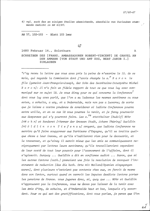 Schreiben von Robert-Vincent de Gravel, Ambassador von Frankreich, an Beat Jakob I. Zurlauben, Ammann von Stadt und Amt Zug