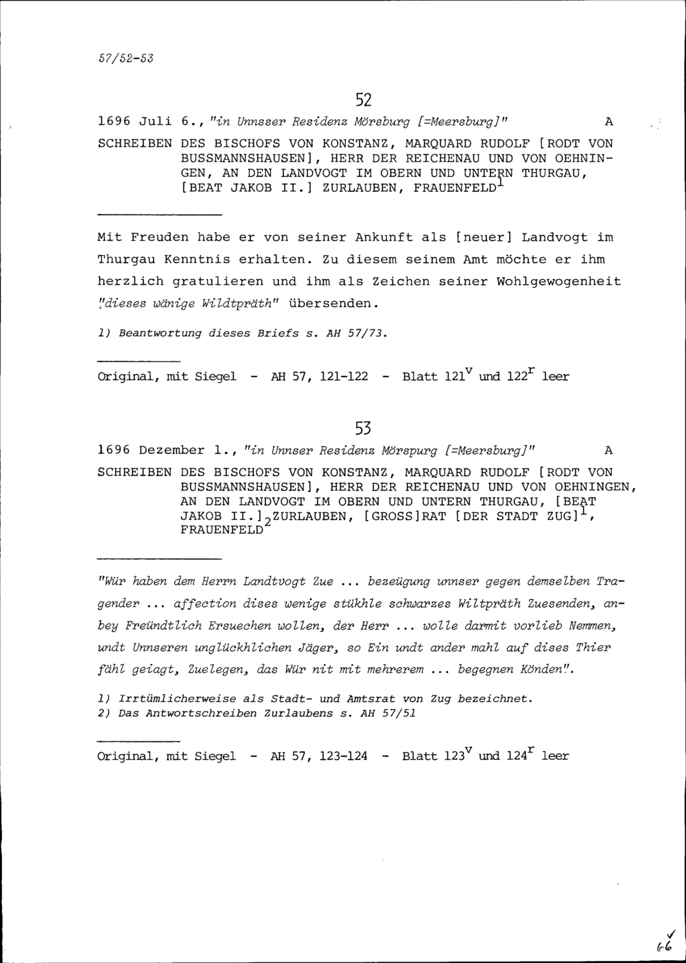 Schreiben von Marquard Rudolf Rodt von Bausmannshausen, Bischof von Konstanz, Herr der Reichenau und von Öhningen, an Beat Jakob II. Zurlauben, Landvogt im Obern und Unteren Thurgau, Frauenfeld