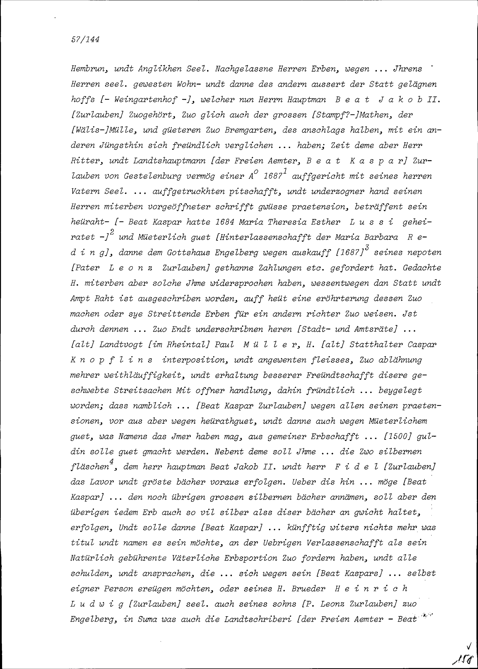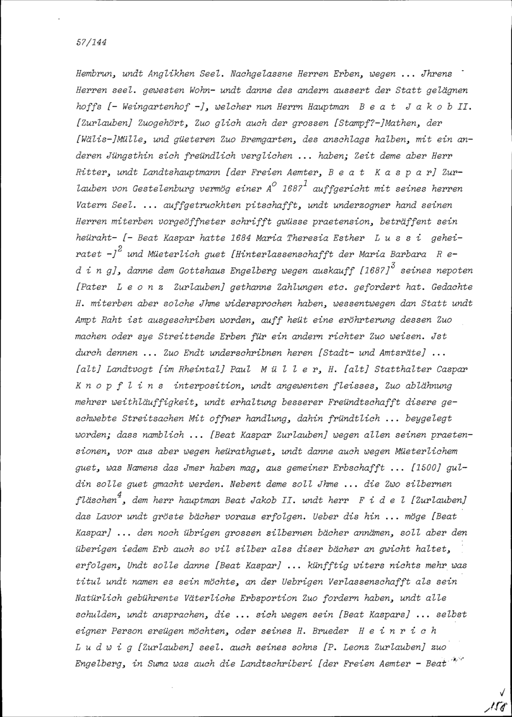 Ratsbeschluss des Stadt- und Amtrats Zug in Zusammenhang mit der Hinterlassenschaft von Beat Jakob I. Zurlauben