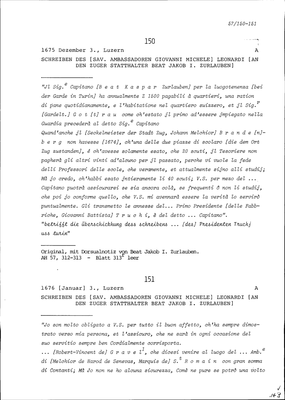 Schreiben von Giovanni Michele Leonardi, Ambassador von Savoyen, an Beat Jakob I. Zurlauben, Statthalter Zug