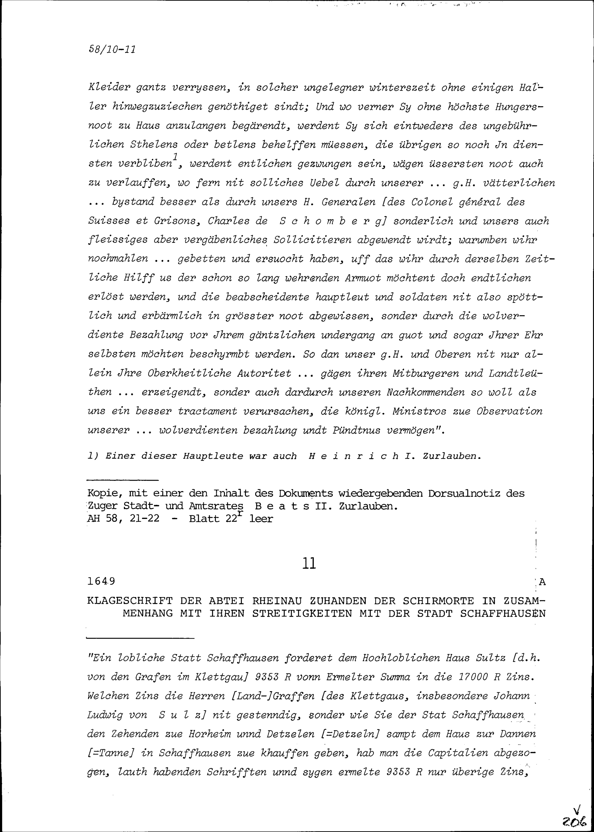 Klageschrift der Abtei Rheinau zuhanden der Schirmorte in Zusammenhang mit ihren Streitigkeiten mit der Stadt Schaffhausen