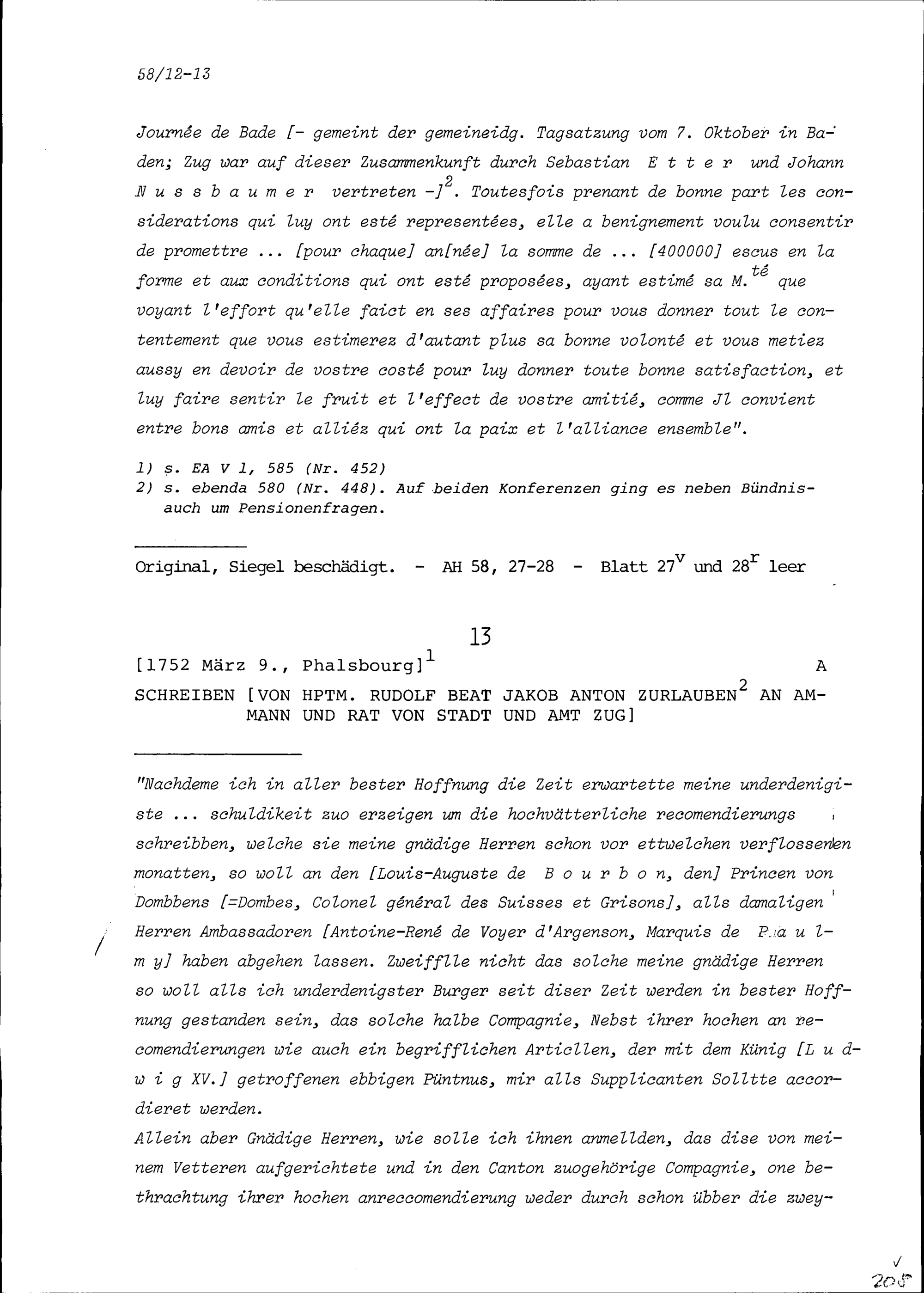 Schreiben von Rudolf Beat Jakob Anton Zurlauben, Hauptmann, an Ammann und Rat von...