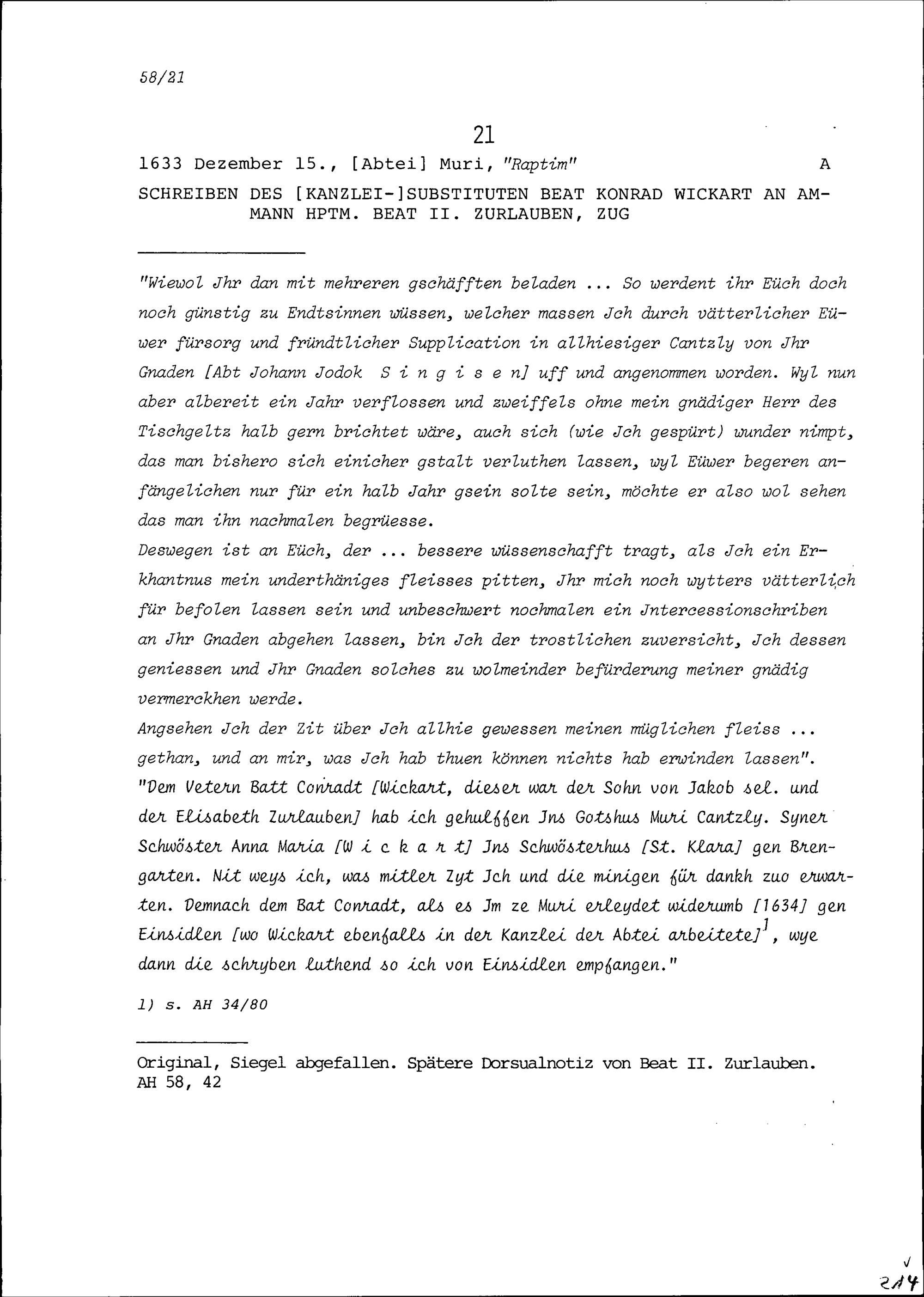 Schreiben von Beat Konrad Wickart, Kanzleisubstitut, an Beat II. Zurlauben, Ammann...