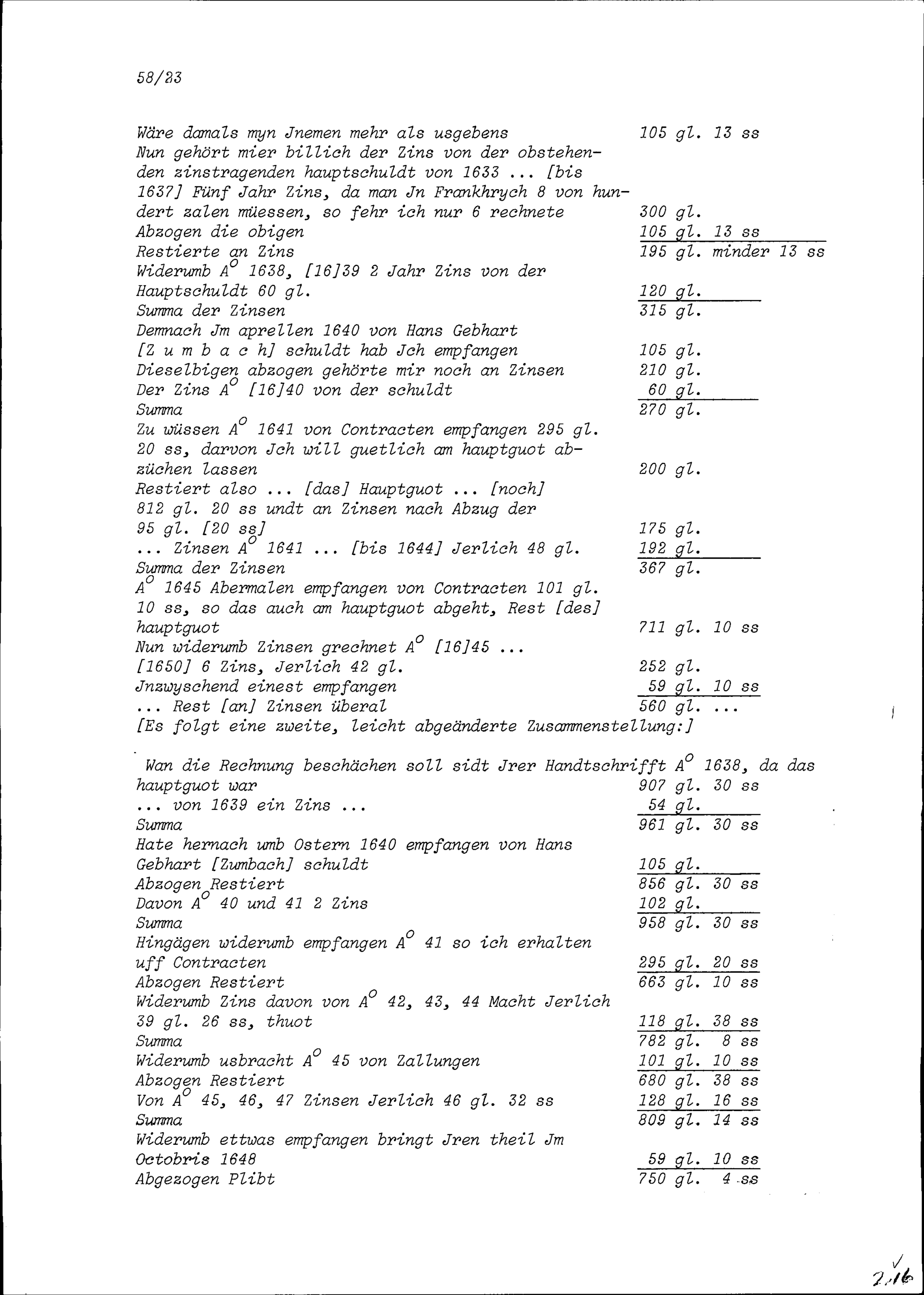 Abrechnung von Beat II. Zurlauben über die Guthaben beziehungsweise Schulden seiner Schwester Elisabeth Zurlauben, herrührend aus der Hinterlassenschaft von Konrad III. Zurlauben