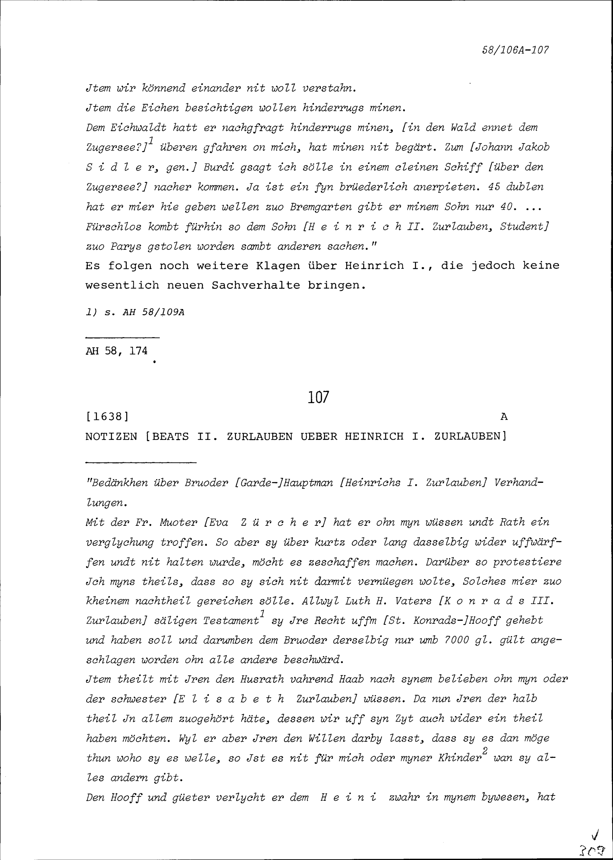 Notiz von Beat II. Zurlauben über Heinrich I. Zurlauben