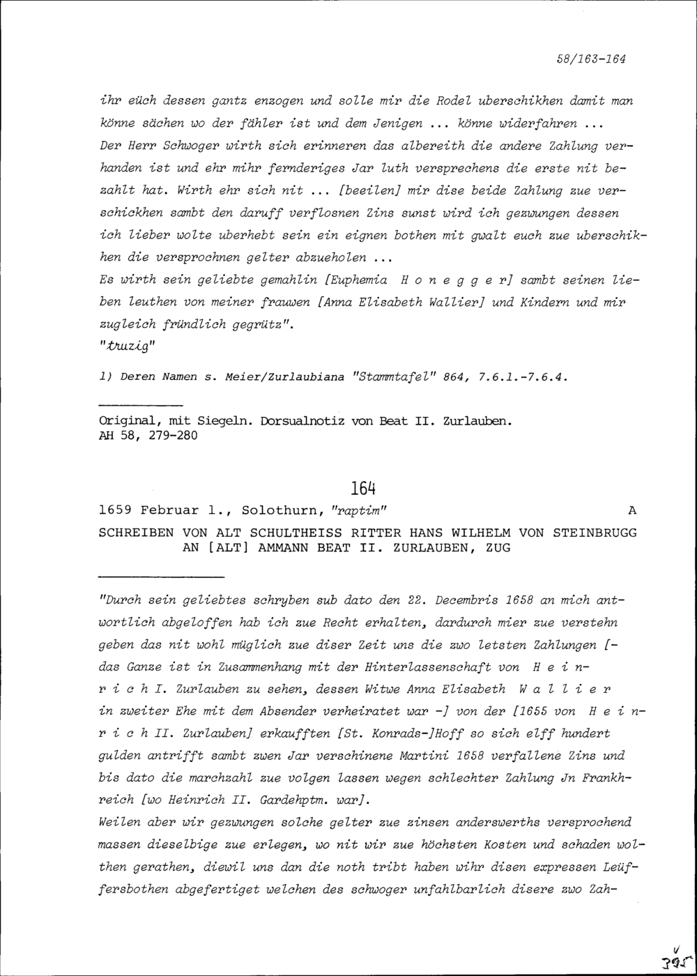 Schreiben von Hans Wilhelm von Steinbrugg, Altschultheiss, an Beat II. Zurlauben, Altammann, Zug