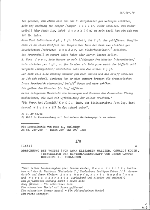 Abrechnung von Oswald Kolin, Vogt von Anna Elisabeth Wallier, bezüglich der Hinterlassenschaft von Heinrich I. Zurlauben