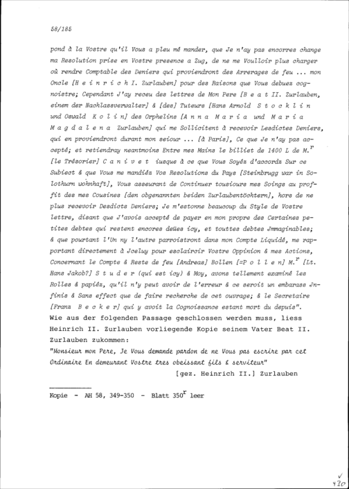 Schreiben von Heinrich II. Zurlauben, Gardehauptmann, an Hans Wilhelm von Steinbrugg
