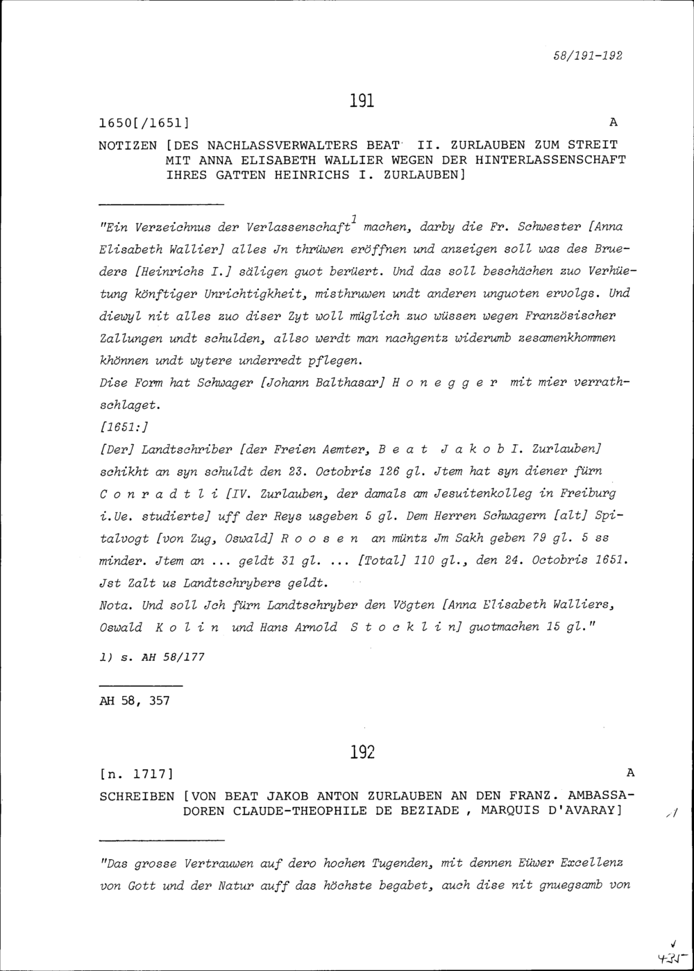 Notiz von Beat II. Zurlauben, Nachlassverwalter, zum Streit mit Anna Elisabeth Wallier...