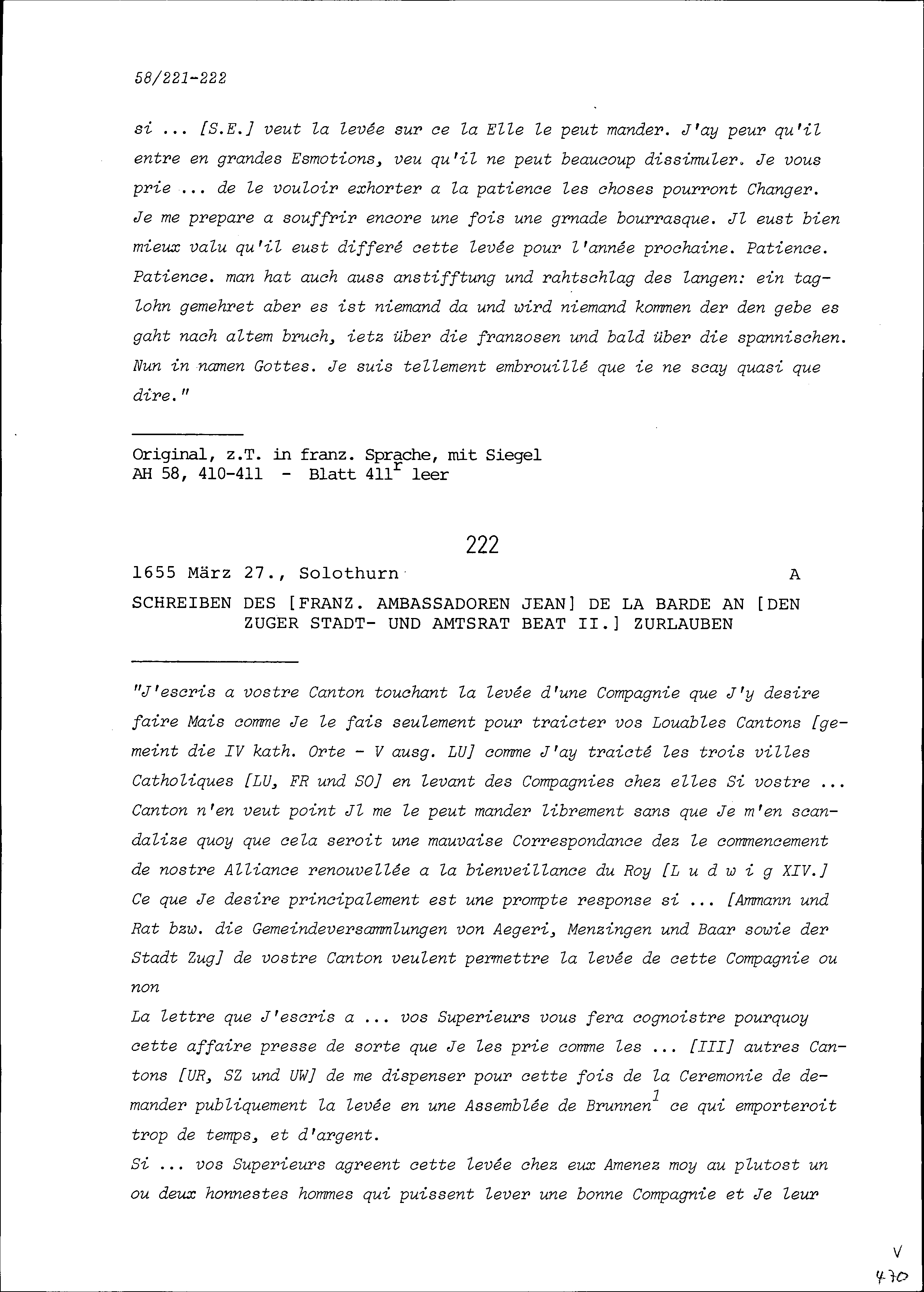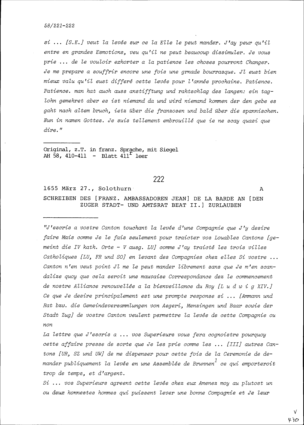 Schreiben von Jean de la Barde, Ambassador von Frankreich, an Beat II. Zurlauben,...