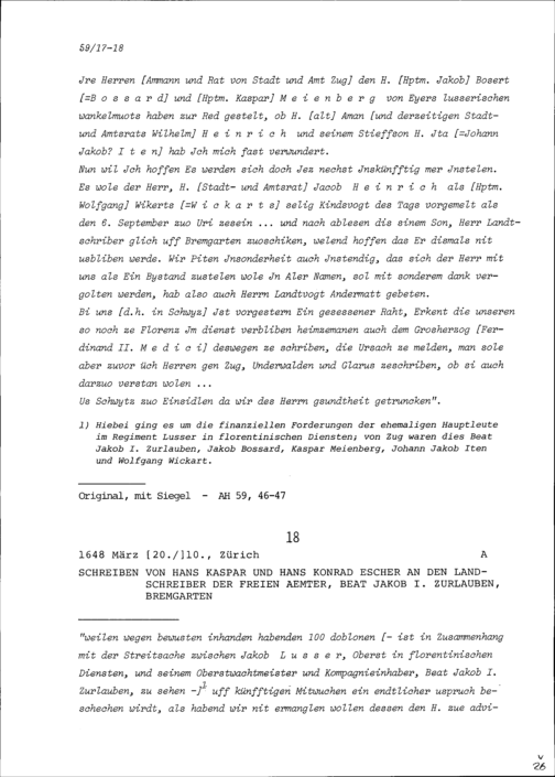 Schreiben von Hans Kaspar und Hans Konrad Escher an Beat Jakob I. Zurlauben, Landschreiber der Freien Ämter, Bremgarten