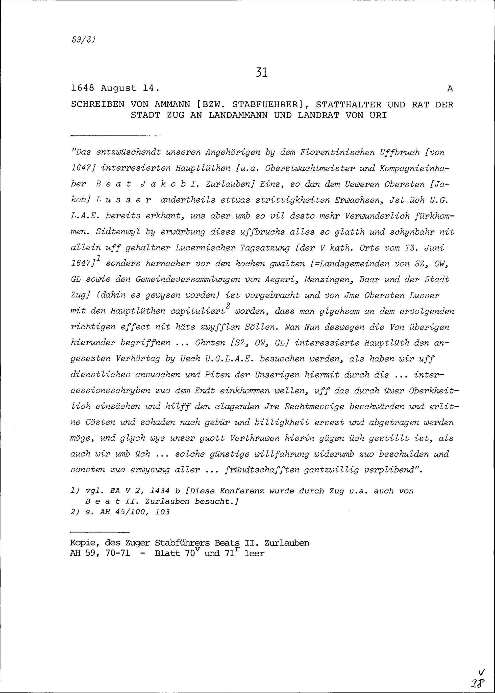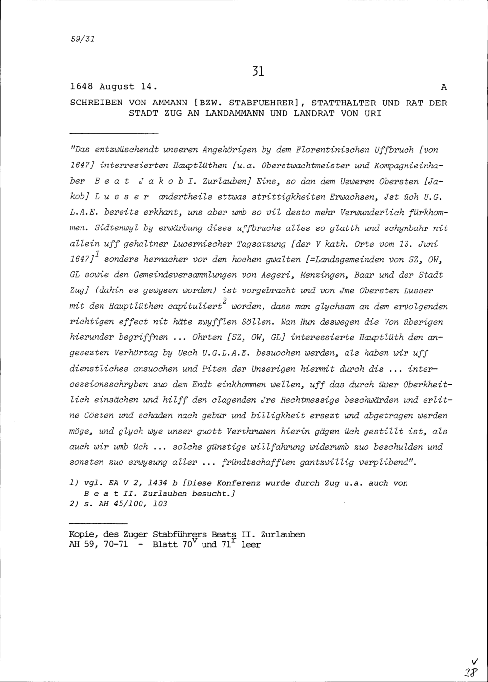 Schreiben des Ammanns (Stabführers), Statthalters und Rate der Stadt Zug an Landammann...
