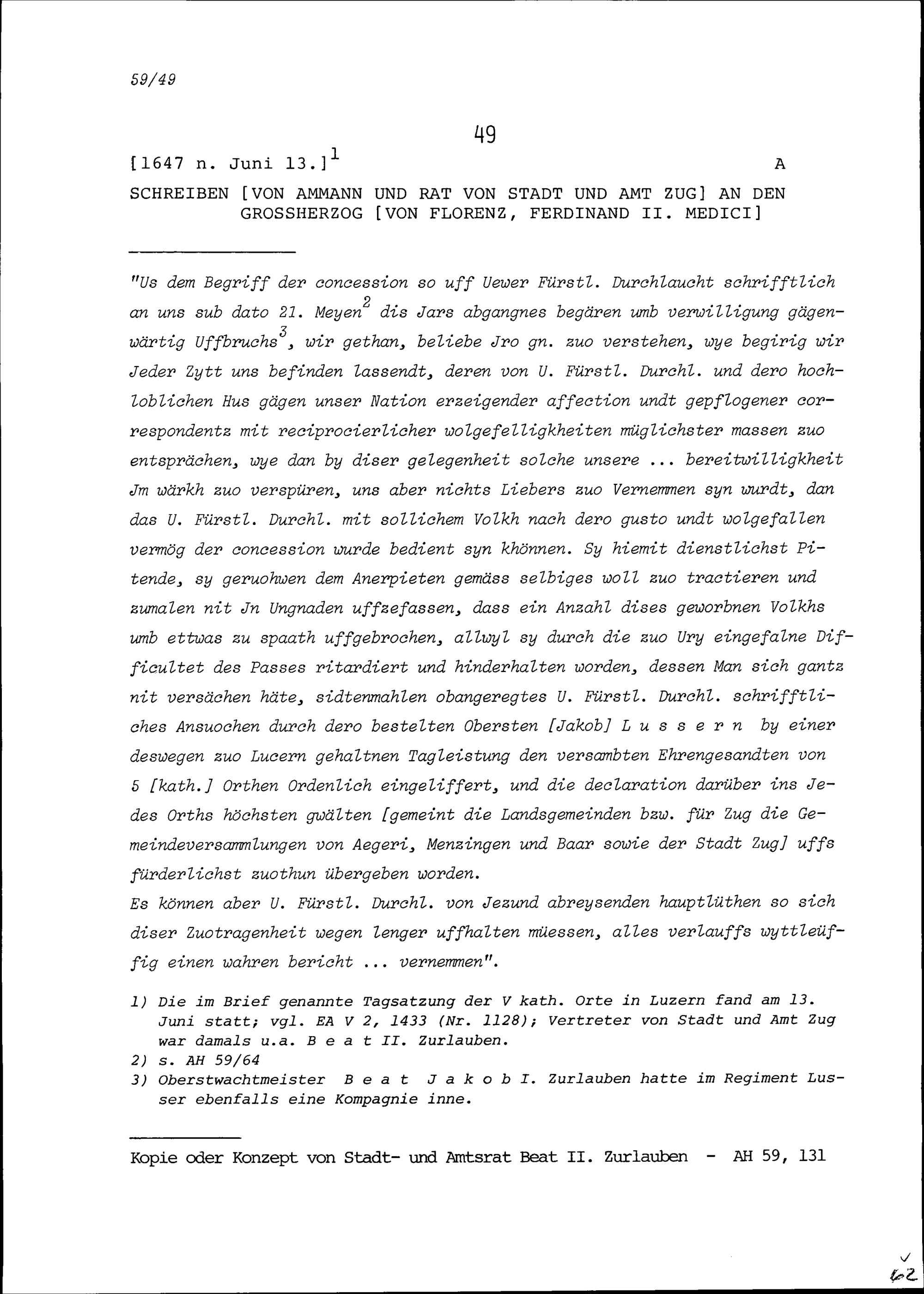 Schreiben des Ammanns und Rats von Stadt und Amt Zug an Ferdinand II. Medici, Grossherzog von Florenz