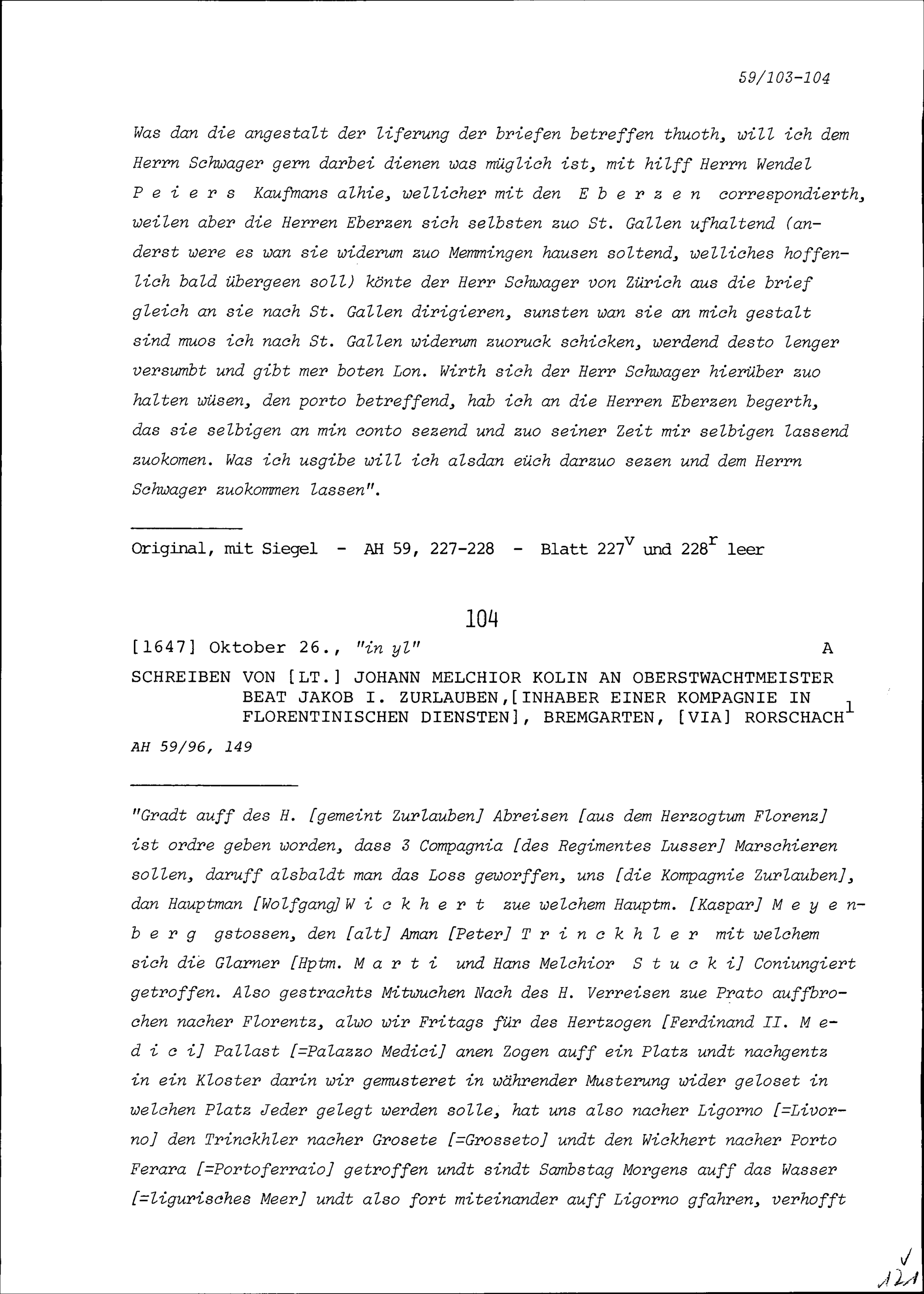 Schreiben von Johann Melchior Kolin, Leutnant, an Beat Jakob I. Zurlauben, Oberstwachtmeister und Inhaber einer Kompanie in florentinischen Diensten, Bremgarten