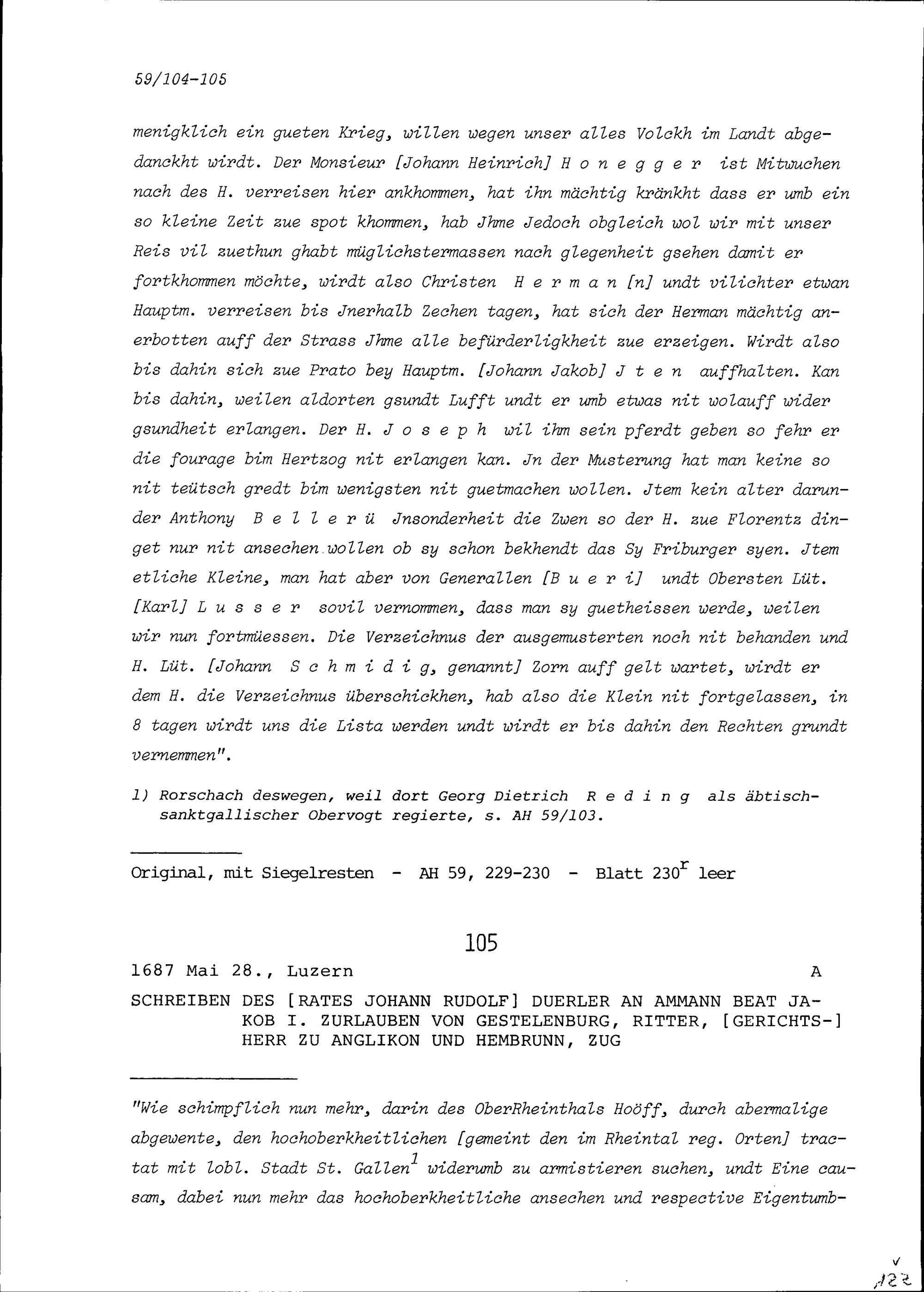 Schreiben von Johann Rudolf Dürler, Rat, an Beat Jakob I. Zurlauben, Ammann und Gerichtsherr zu Anglikon und Hembrunn, Zug