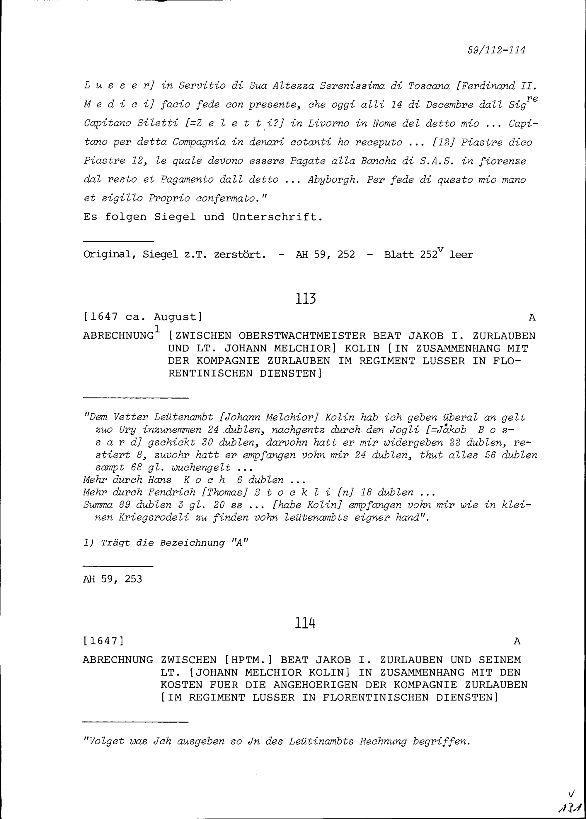 Abrechnung zwischen Beat Jakob I. Zurlauben, Oberstwachtmeister, und Johann Melchior Kolin, Leutnant, in Zusammenhang mit der Kompanie Zurlauben im Regiment Lusser in florentinischen Diensten