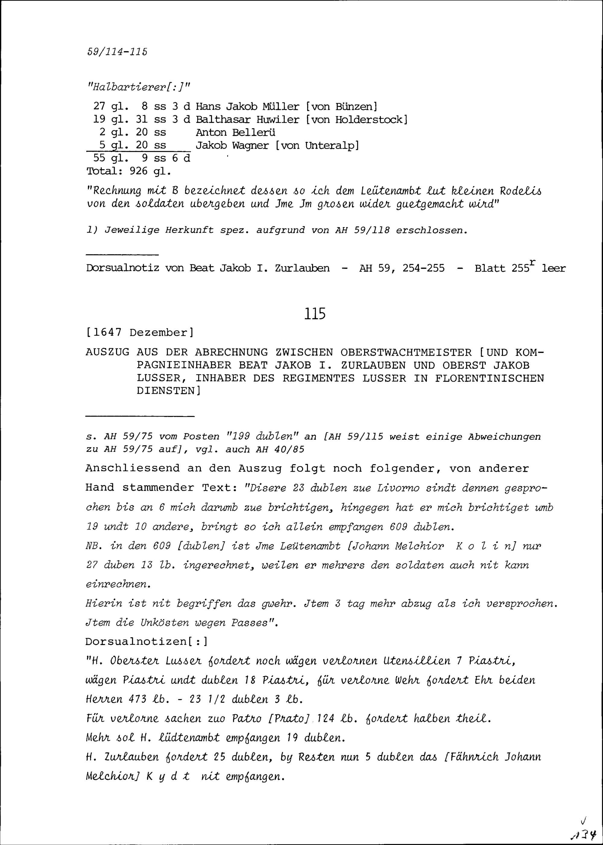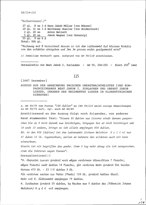 Abrechnung zwischen Beat Jakob I. Zurlauben, Oberstwachtmeister und Kompanieinhaber, und Jakob Lusser, Oberst und Inhaber des Regiments Lusser in florentinischen Diensten