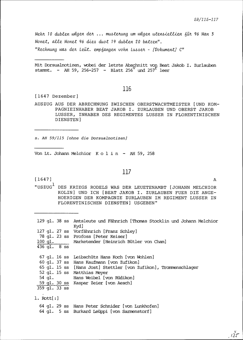 Abrechnung zwischen Beat Jakob I. Zurlauben, Oberstwachtmeister und Kompanieinhaber, und Jakob Lusser, Oberst und Inhaber des Regiments Lusser in florentinischen Diensten
