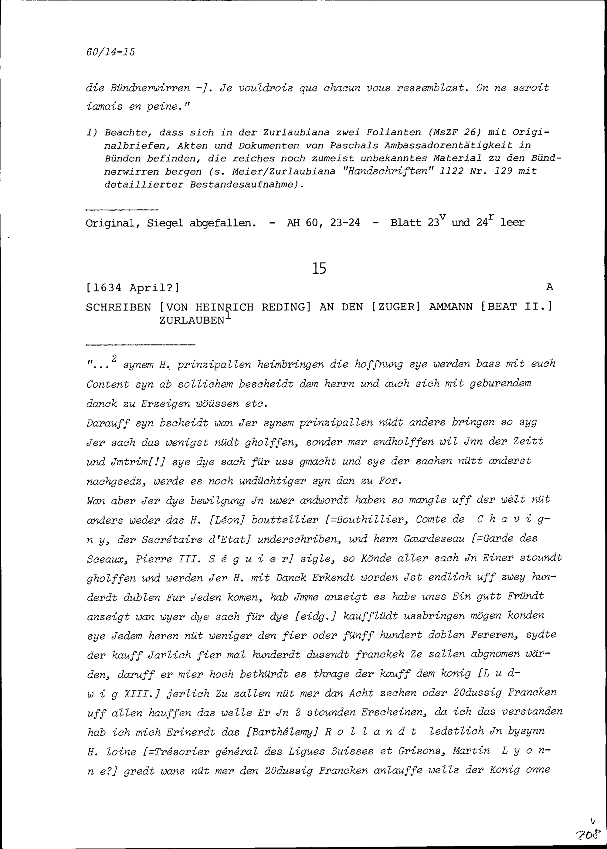 Schreiben von Heinrich Reding an Beat II. Zurlauben, Ammann Zug