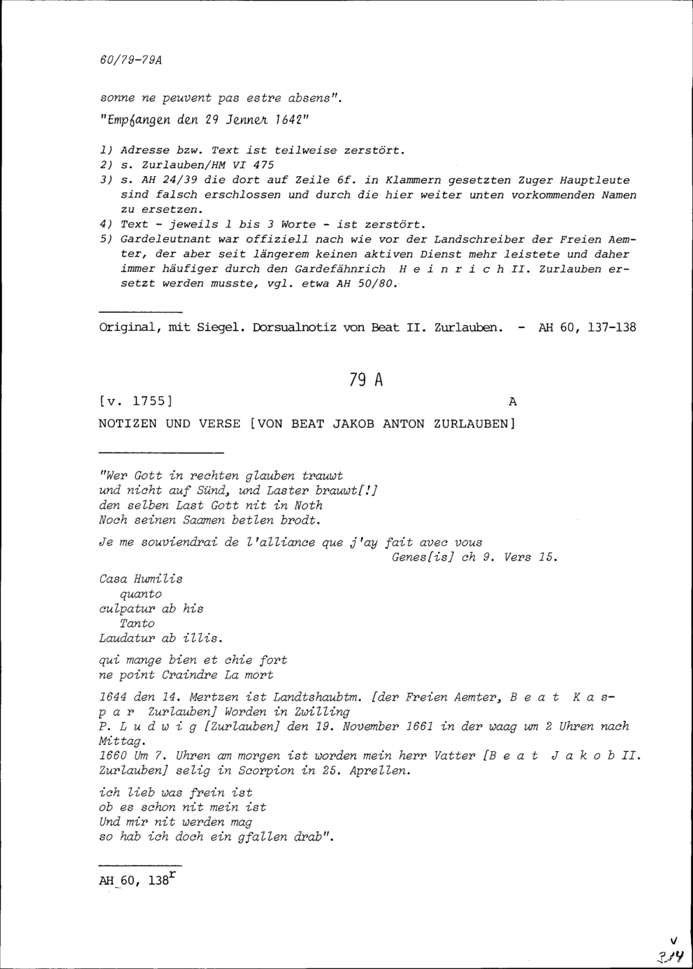 Notiz und Verse von Beat Jakob Anton Zurlauben