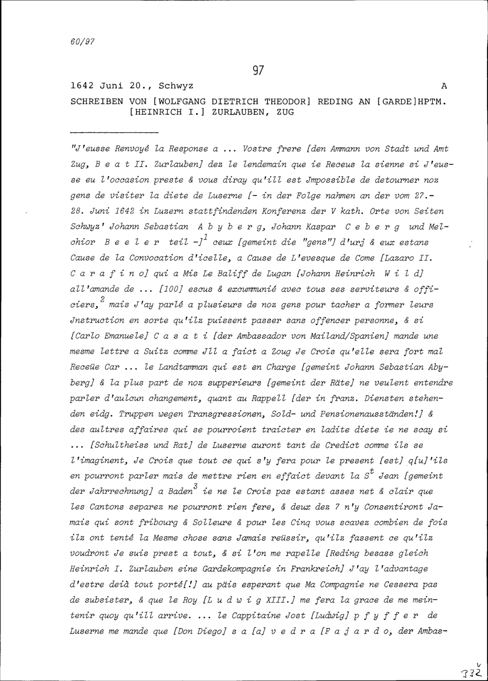 Schreiben von Wolfgang Dietrich Theodor Reding an Heinrich I. Zurlauben, Gardehauptmann, Zug