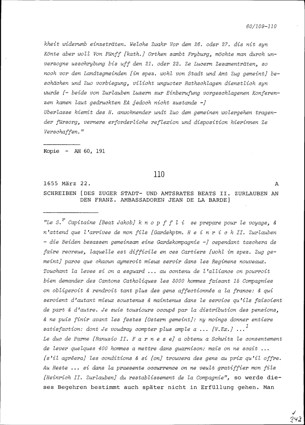Schreiben von Beat II. Zurlauben, Stadt- und Amtrat Zug, an Jean de la Barde, Ambassador von Frankreich
