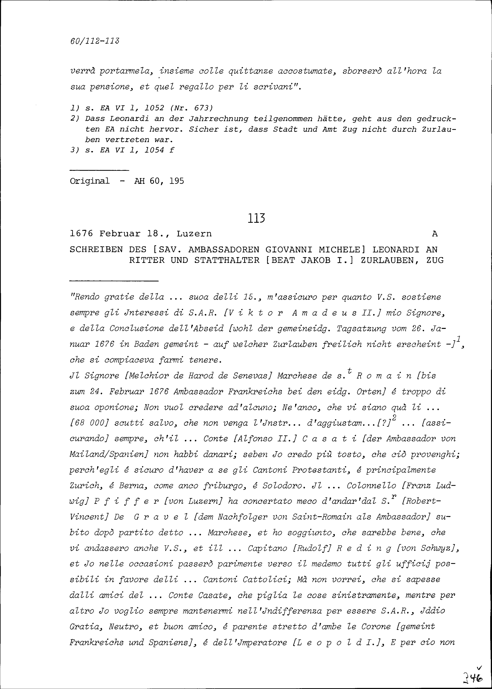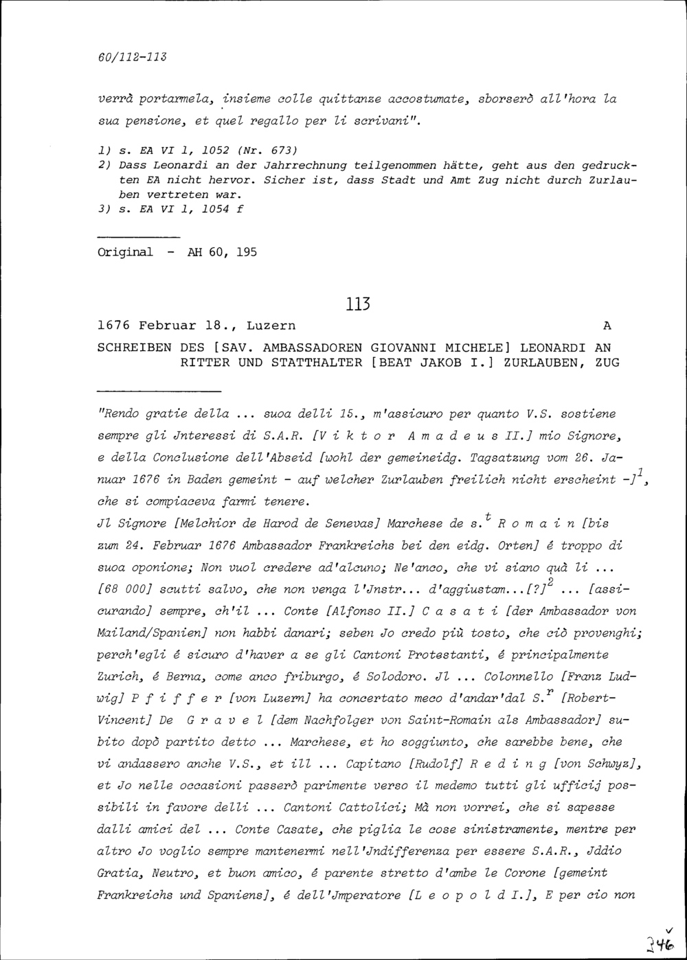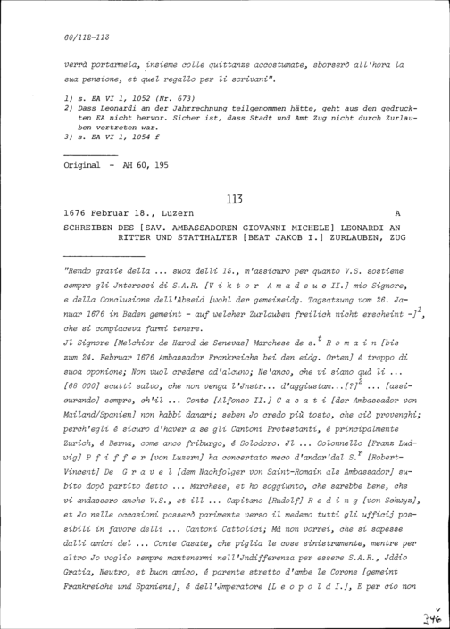 Schreiben von Giovanni Michele Leonardi, Ambassador von Savoyen, an Beat Jakob I. Zurlauben, Statthalter, Zug