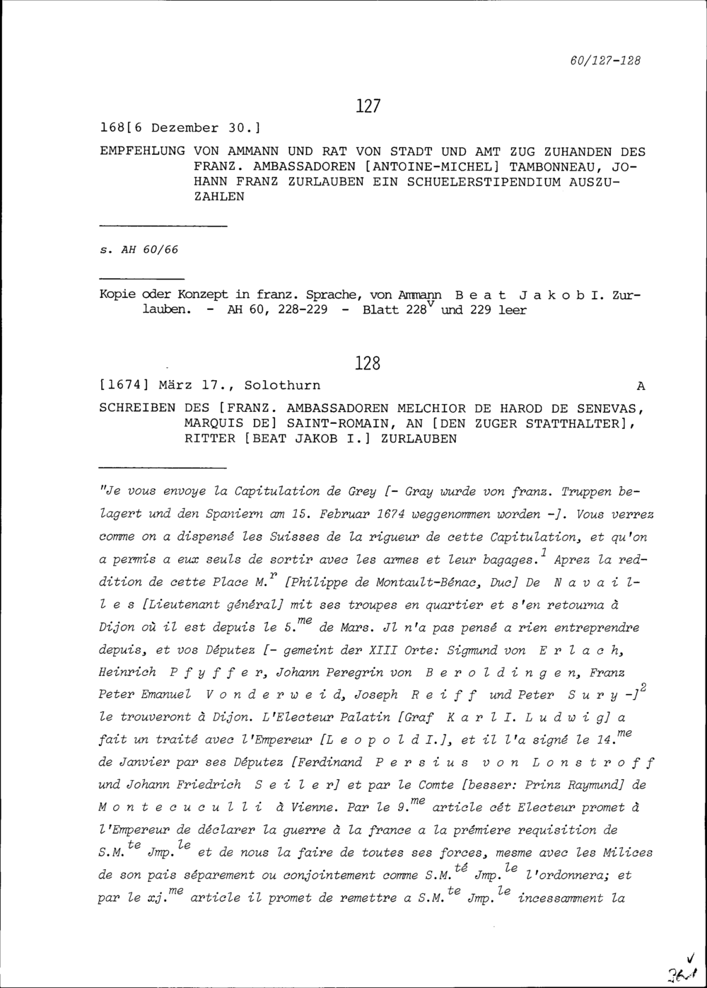 Empfehlung des Ammanns und Rats von Stadt und Amt Zug zuhanden von Antoine-Michel Tambonneau, Ambassador von Frankreich, an Johann Franz Zurlauben ein Schülerstipendium auszuzahlen