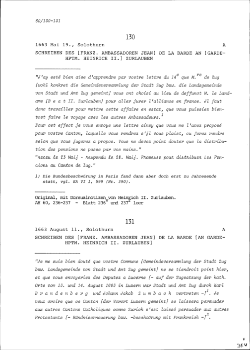 Schreiben von Jean de la Barde, Ambassador von Frankreich, an Heinrich II. Zurlauben, Gardehauptmann