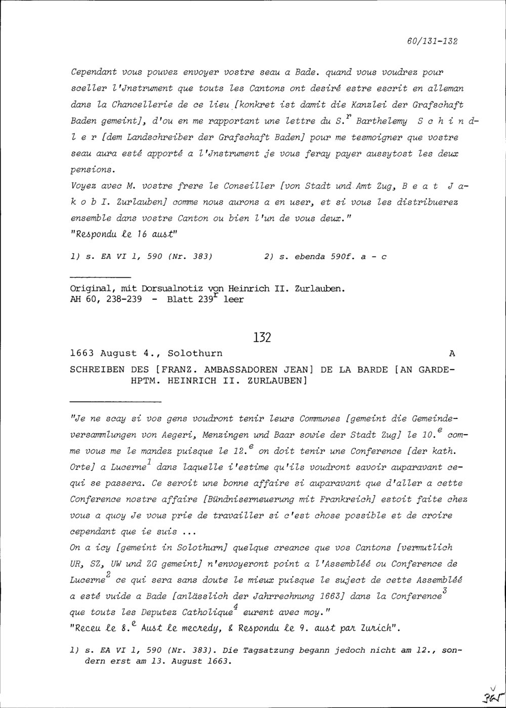 Schreiben von Jean de la Barde, Ambassador von Frankreich, an Heinrich II. Zurlauben, Gardehauptmann