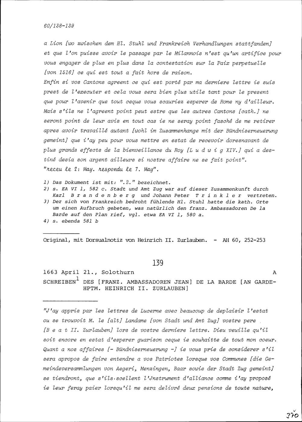 Schreiben von Jean de la Barde, Ambassador von Frankreich, an Heinrich II. Zurlauben, Gardehauptmann
