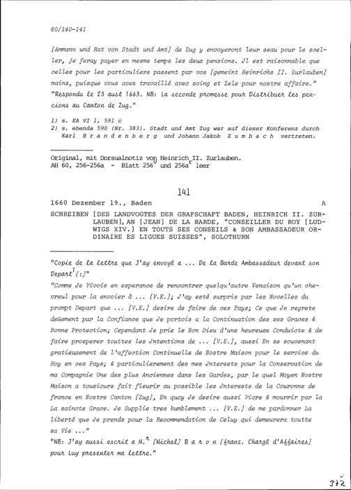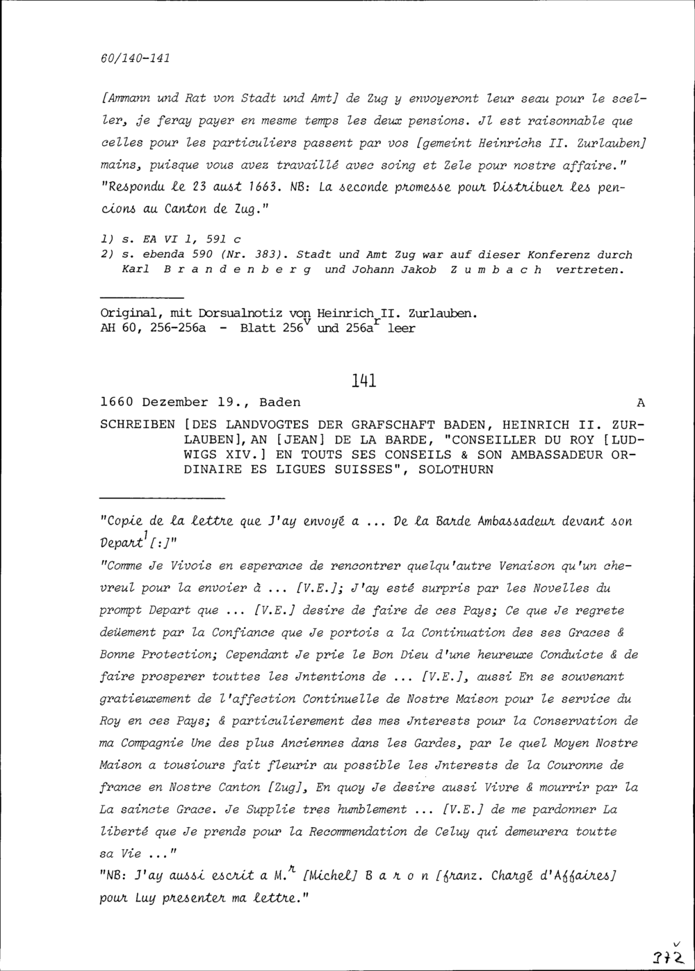 Schreiben von Heinrich II. Zurlauben, Landvogt der Grafschaft Baden, an Jean de la Barde, Ambassador von Frankreich, Solothurn