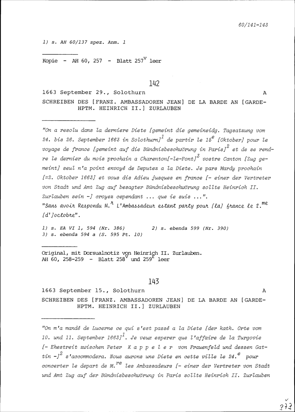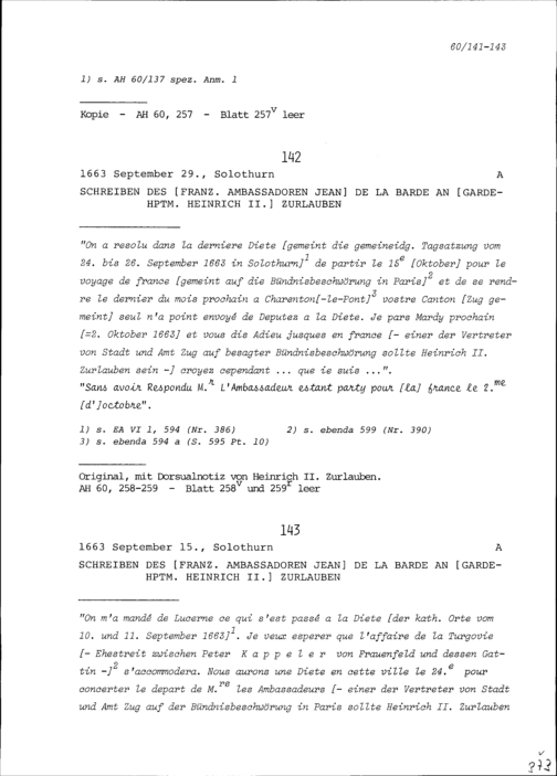 Schreiben von Jean de la Barde, Ambassador von Frankreich, an Heinrich II. Zurlauben, Gardehauptmann