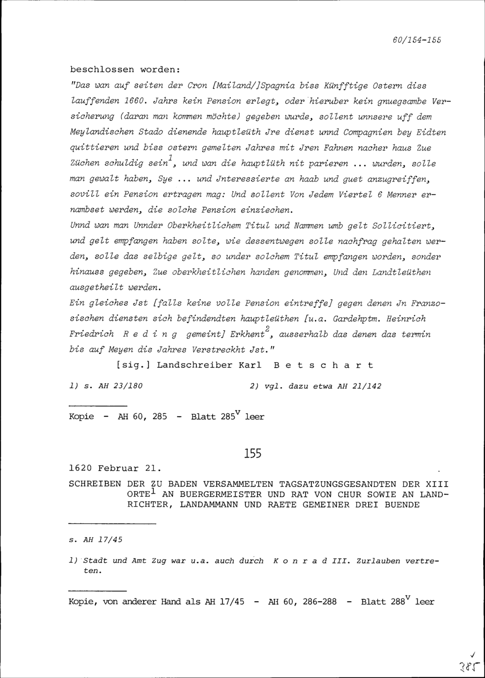 Schreiben der Tagsatzungsgesandten der Dreizehn Orte in Baden an Bürgermeister und Rat der Stadt Chur sowie an Landrichter, Landammann und Räte Gemeiner Drei Bünde