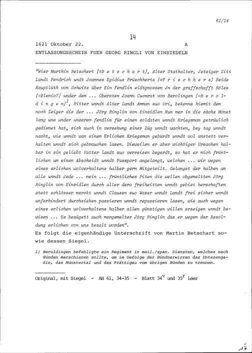 Entlassungsschein für Georg Ringli von Einsiedeln