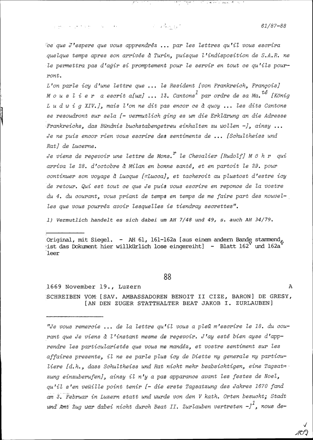 Schreiben von Benoît II. Cize, Baron de Grésy, Ambassador von Frankreich, an Beat Jakob I. Zurlauben, Statthalter Zug