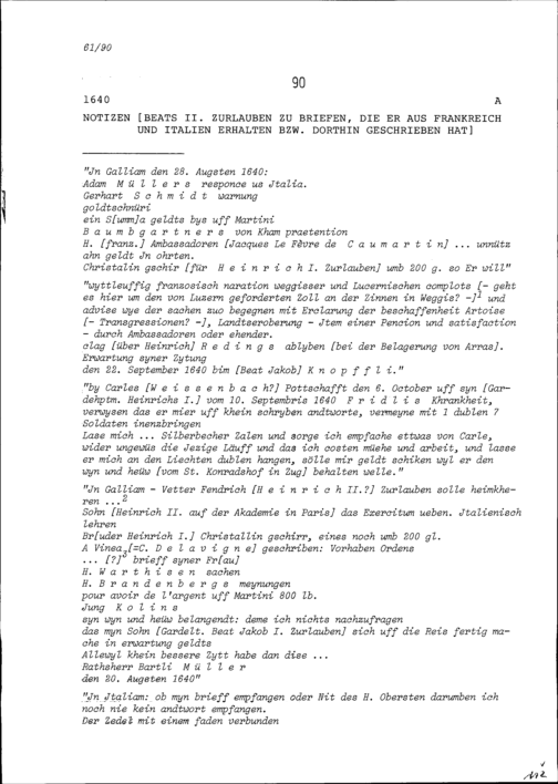 Notiz von Beat II. Zurlauben zu Schreiben, die er aus Frankreich und Italien erhalten beziehungsweise dorthin geschrieben hat