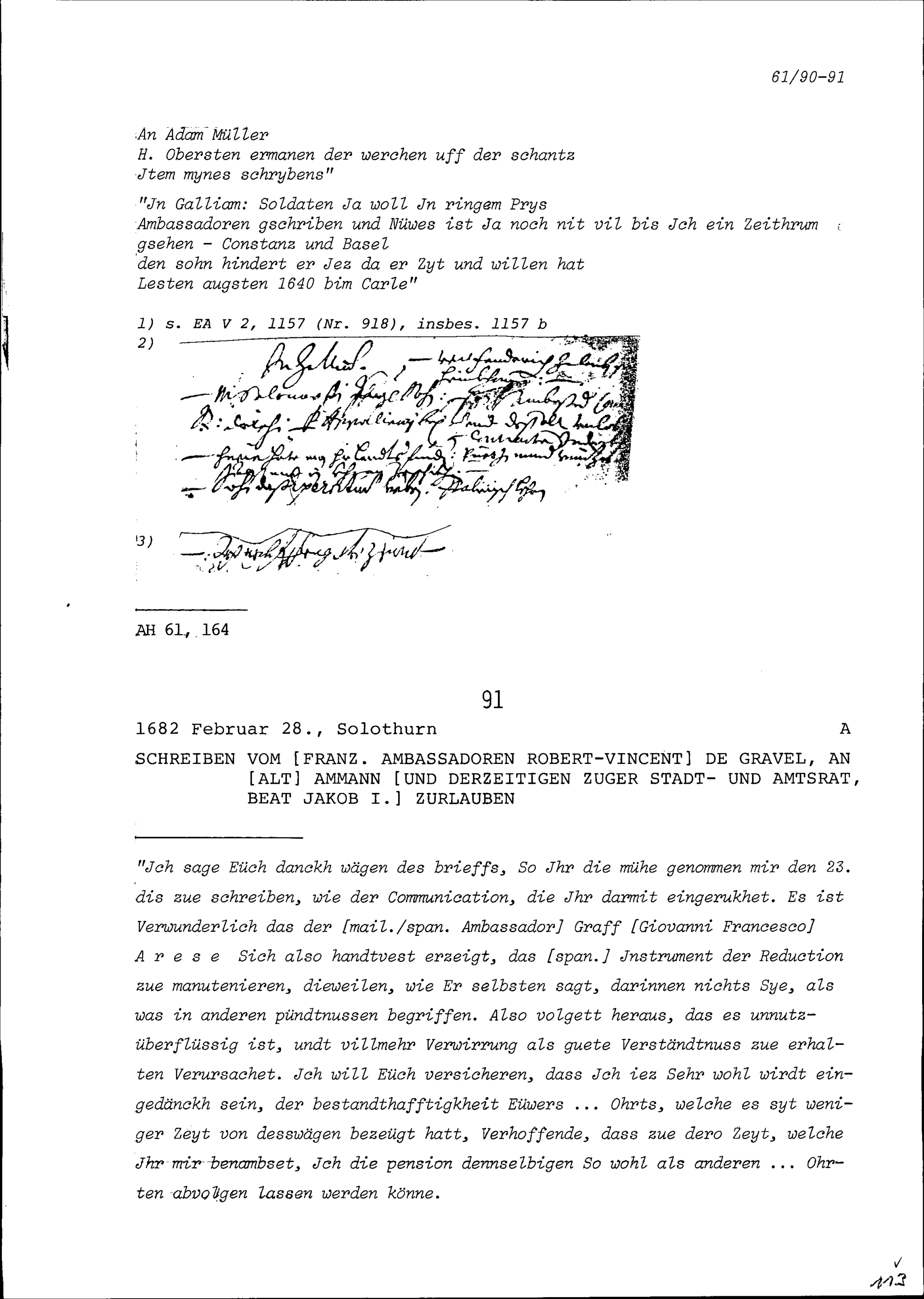 Schreiben von Robert-Vincent de Gravel, Ambassador von Frankreich, an Beat Jakob I. Zurlauben, Altammann und Stadt- und Amtrat Zug