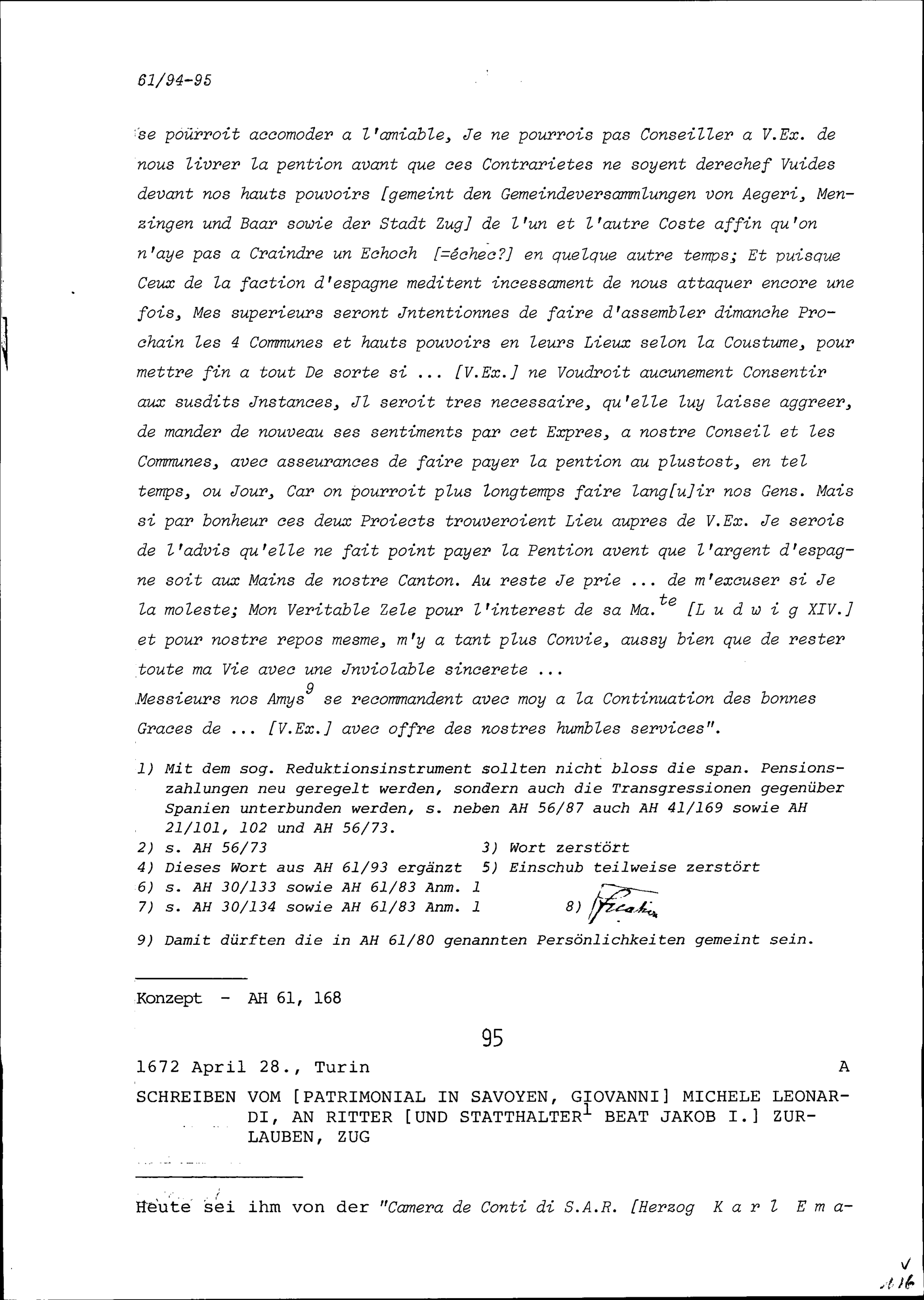 Schreiben von Giovanni Michele Leonardi, Patrimonial in Savoyen, an Beat Jakob I. Zurlauben, Statthalter, Zug