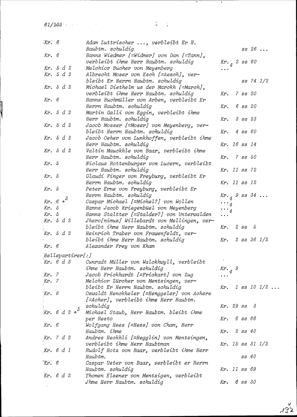 Mannschaftsrodel der Kompanie von Konrad III. Zurlauben, Hauptmann, und Soldabrechnung samt Abzügen