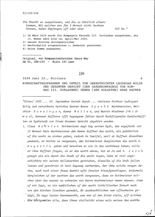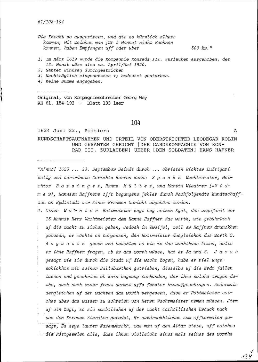 Kundschaftsaufnahmen und Urteil von Leodegar Kolin, Oberstrichter, und Gesamtem Gericht der Gardekompanie von Konrad III. Zurlauben über Hans Hafner, Soldat