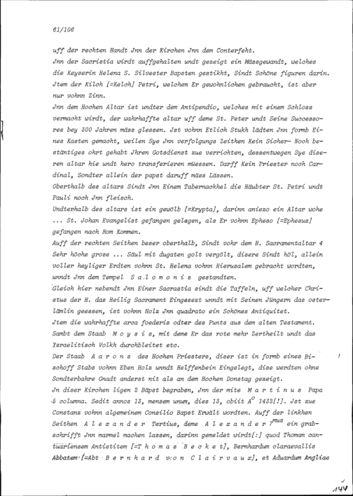 Beschreibung von Beat Kaspar Zurlauben über die anlässlich seiner Romreise besuchten Kirchen und andern Sehenswürdigkeiten