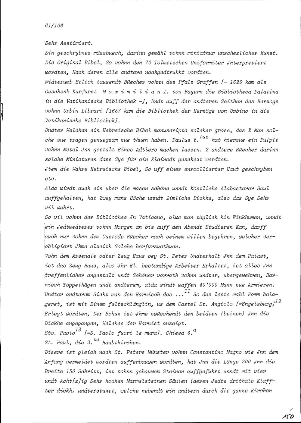 Beschreibung von Beat Kaspar Zurlauben über die anlässlich seiner Romreise besuchten Kirchen und andern Sehenswürdigkeiten