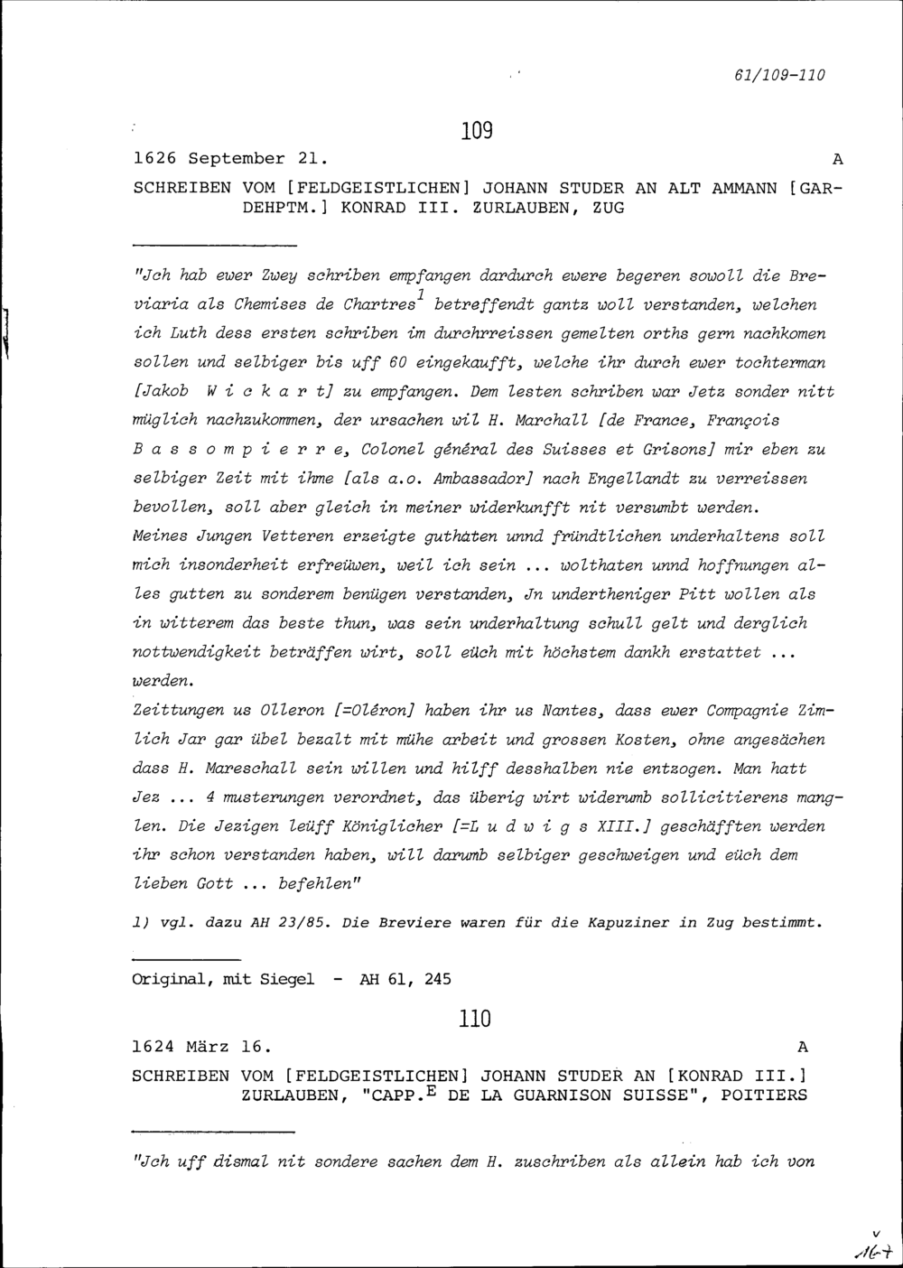 Schreiben von Johann Studer, Feldgeistlicher, an Konrad III. Zurlauben, Altammann und Gardehauptmann, Zug
