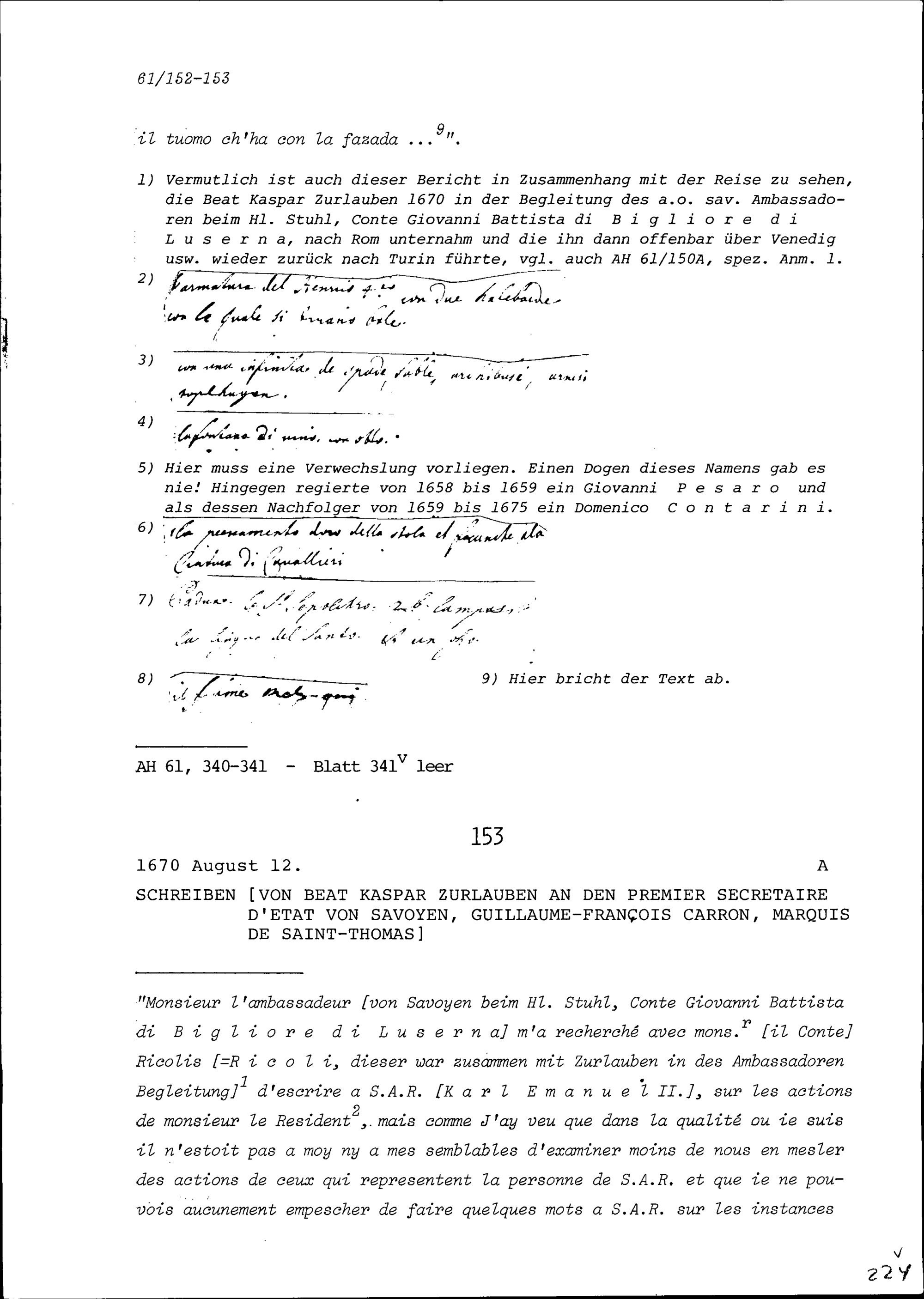 Schreiben von Beat Kaspar Zurlauben an Guillaume-François Carron, Marquis de Saint-Thomas, Ersten Staatssekretär von Savoyen