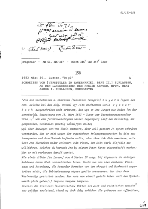 Schreiben von Beat II. Zurlauben, Vermittler im Bauernkrieg, an Beat Jakob I. Zurlauben,...