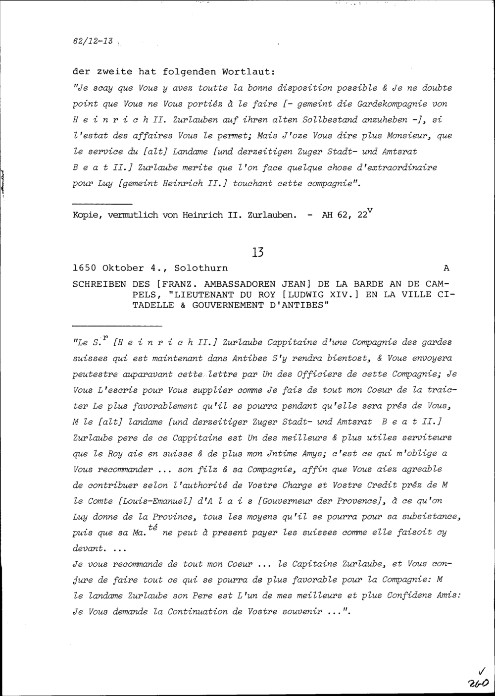 Schreiben von Jean de la Barde, Ambassador von Frankreich, an NN de Campels, Antibes