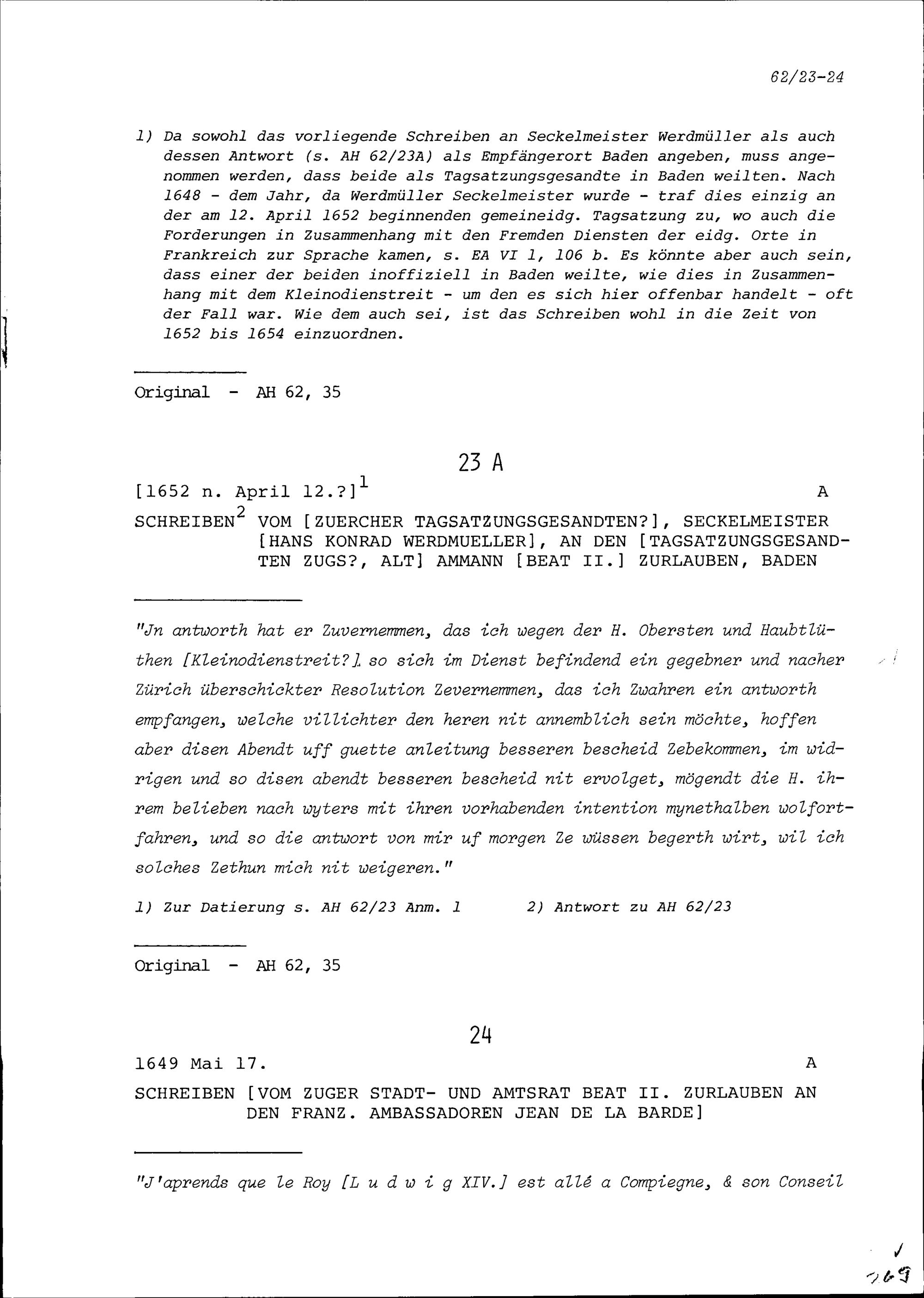 Schreiben von Hans Konrad Werdmüller, Zürcher Tagsatzungsgesandter und Seckelmeister, an Beat II. Zurlauben, Tagsatzungsgesandter von Zug und Altammann Baden