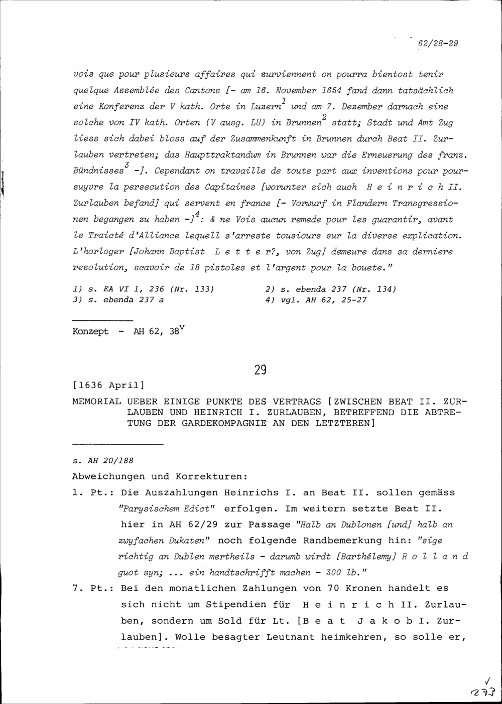 Notiz über einige Punkte des Vertrags zwischen Beat II. Zurlauben und Heinrich I. Zurlauben betreffend die Abtretung der Gardekompanie an den letzteren